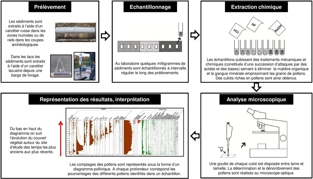 La palynologie est une science qui étudie les grains de pollen et les spores conservés dans les sédiments anciens dans le but de reconstituer l’histoire de la végétation d’un lieu donné. Les changements climatiques ainsi que l’intervention de l’homme sur son environnement végétal (défrichement, plantation) sont les principaux facteurs qui vont faire évoluer la composition de la végétation au cours du temps.